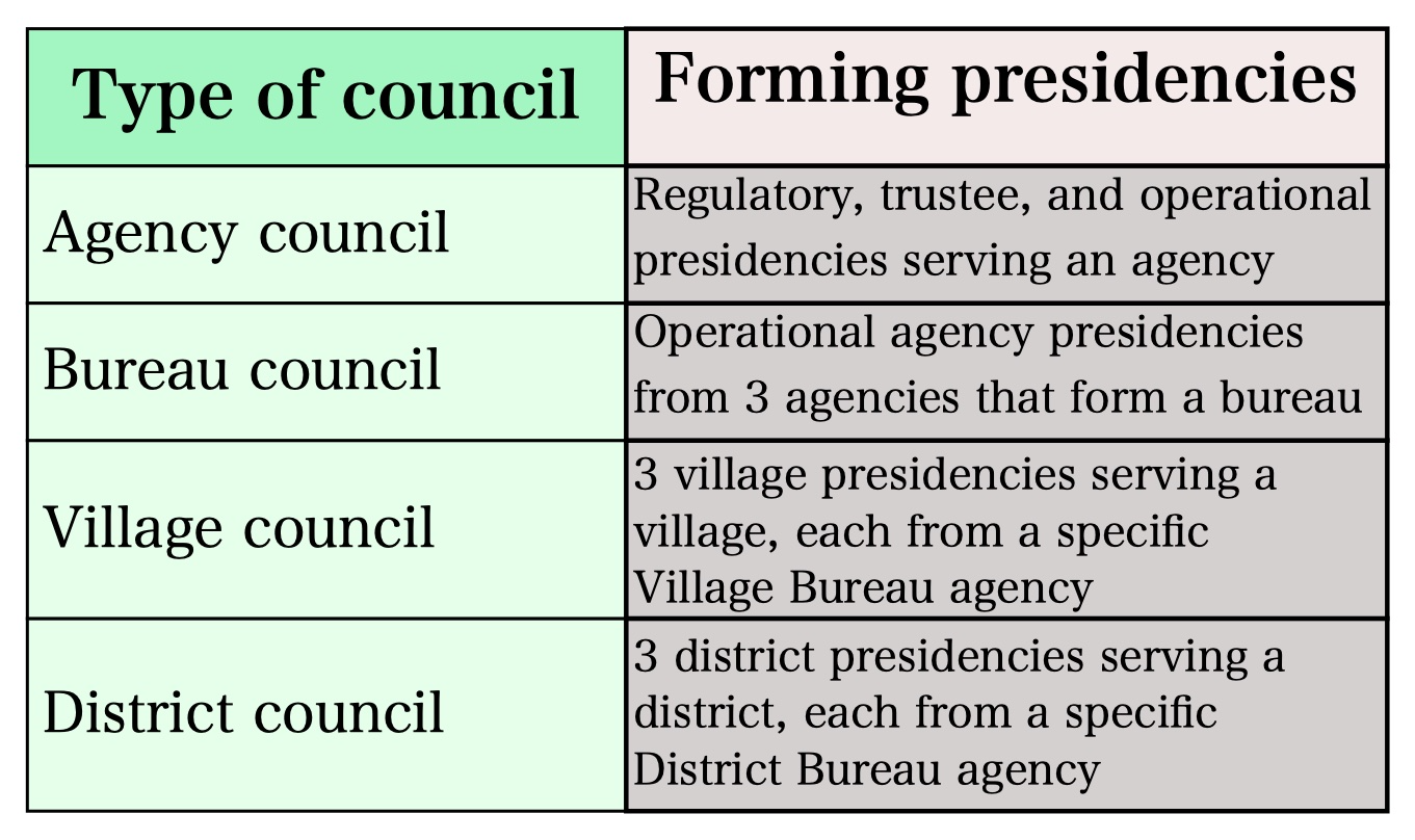 The three agency presidencies that serve each of the 24 agencies form an agency council, which serves as an important tool of checking individual performance and a platform for collaborative service. Village and district presidencies also form village and district councils respectively. In addition, operational agency presidencies serving three agencies in the same bureau form a bureau council, responsible for fostering inter-agency cooperation and forming consensus on issues of community-wide significance.