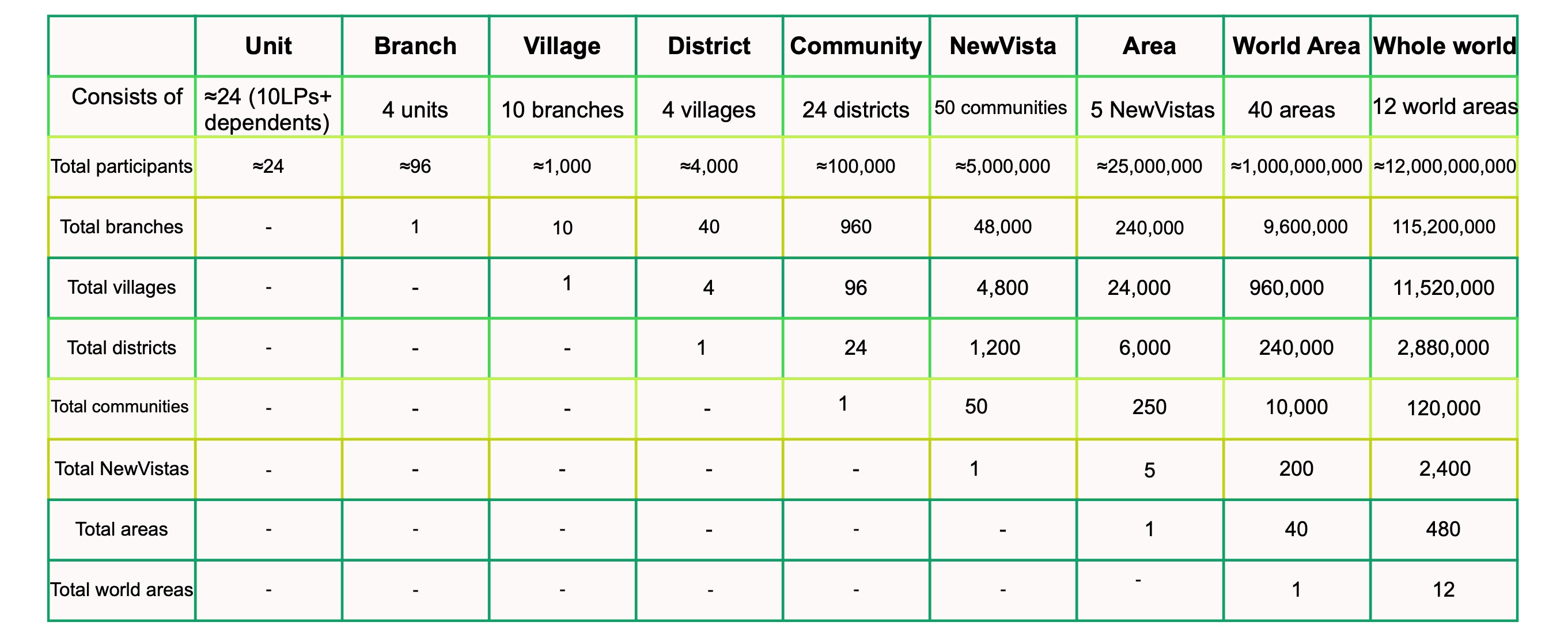 The graphic below shows the organization of the world with all people, or most of them being participants in the NewVistas system.