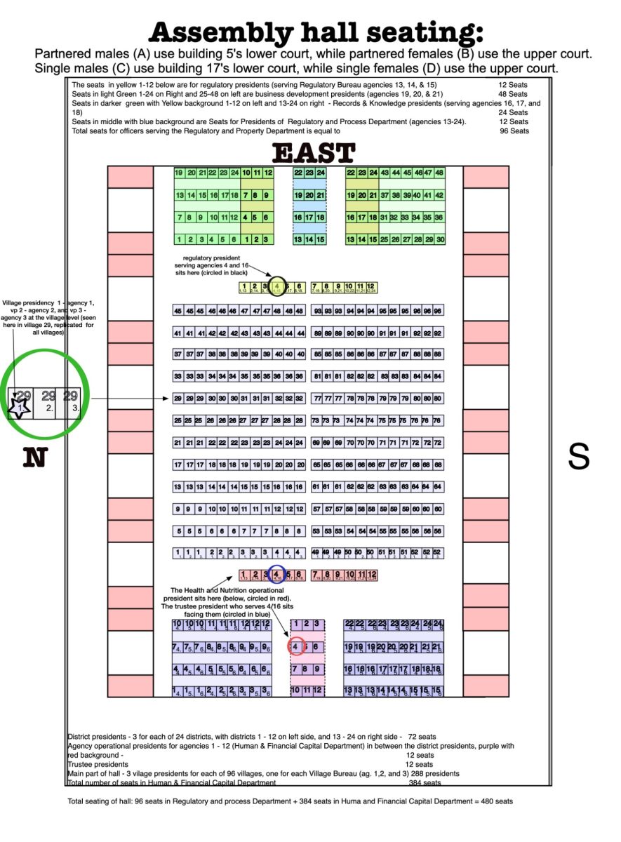 Within an assembly court, the 480 presidents are arranged in terms of demographic presidencies of 3. The District Bureau’s demographic presidency for partnered malesv(4A, 5A, and 6A) sits in the highlighted seats. Various district demographic presidencies also sit on the same row as indicated.