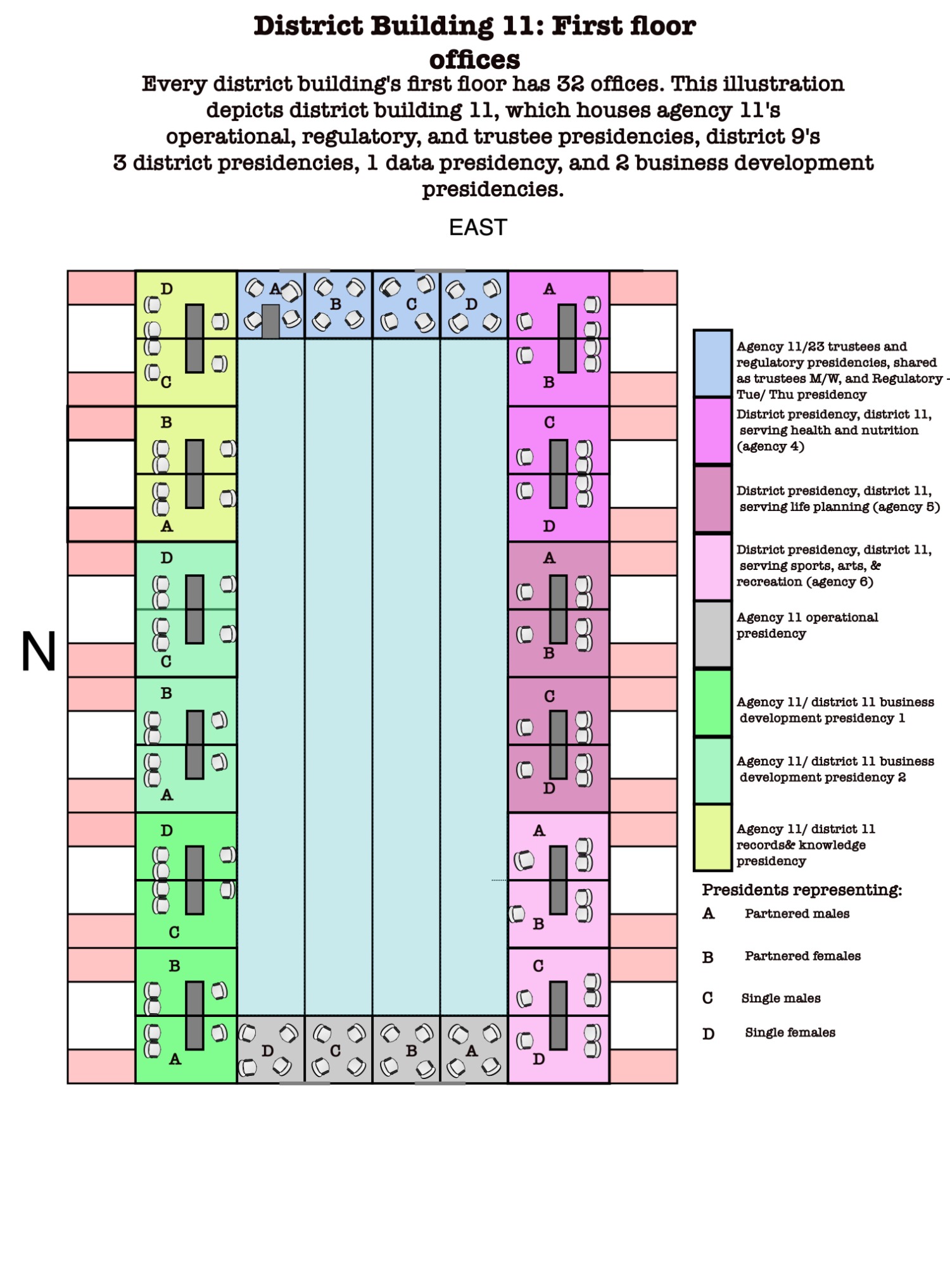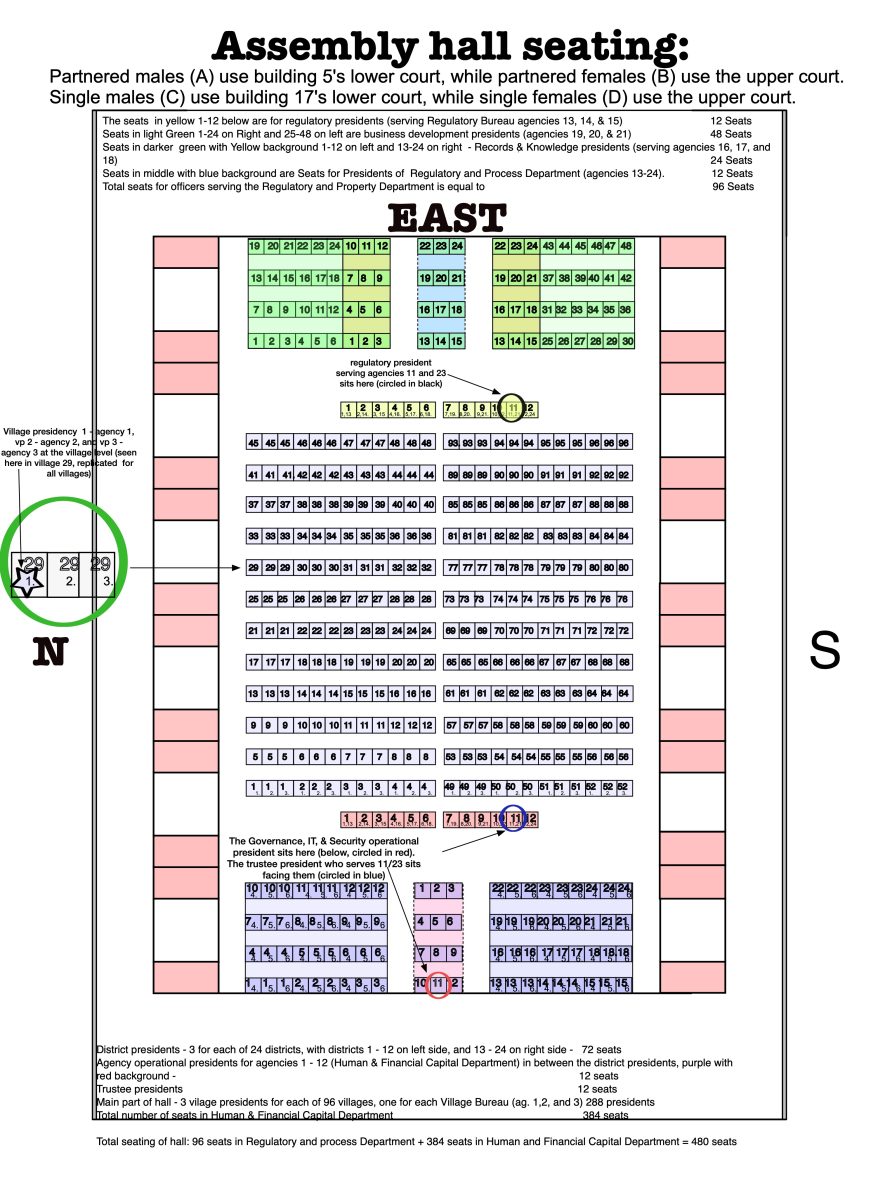 Within an assembly court, the 480 presidents are arranged in terms of demographic presidencies of 3. The Public Administration Bureau’s demographic presidency for partnered males (10A, 11A, and 12A) sits in the highlighted seats. Various district demographic presidencies also sit on the same row.