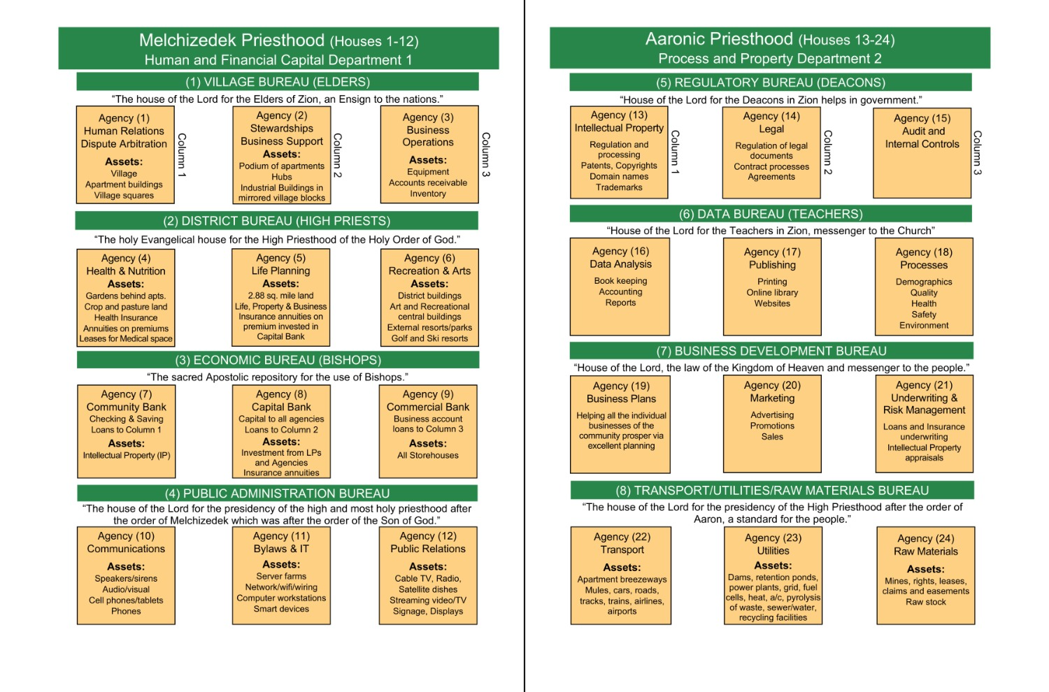 24 agencies arranged into 8 bureaus. Each bureau has a modern name, derived from the original name as revealed in the plat