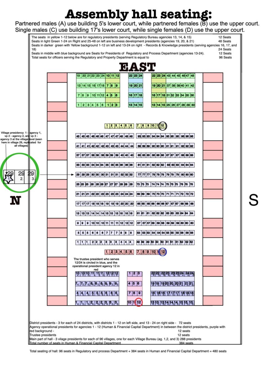 Within an assembly court, the 480 presidents are arranged in terms of demographic presidencies of 3. The Public Administration Bureau’s demographic presidency for partnered males (10A, 11A, and 12A) sits in the highlighted seats. Various district demographic presidencies also sit on the same row.